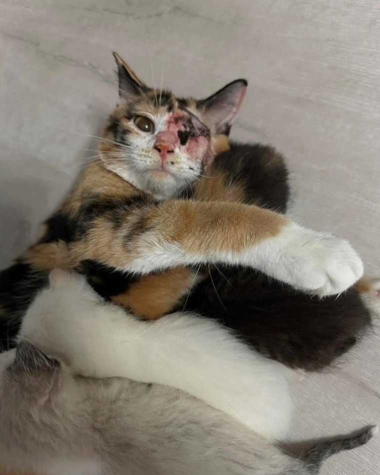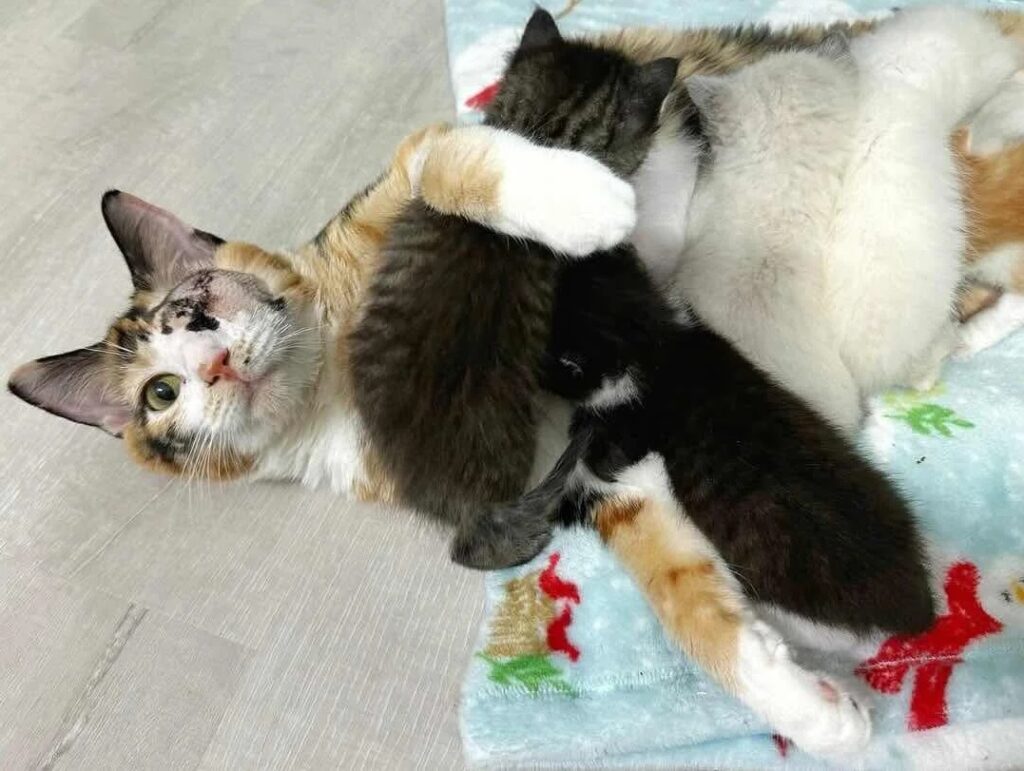 Snow White, even with one eye gone and her jaw healing, continued to mother them all with astonishing patience. At vet visits, she sat calmly while her kittens bounced around the room. She endured everything—from examinations to medications—like she knew it was all part of the journey back to health.