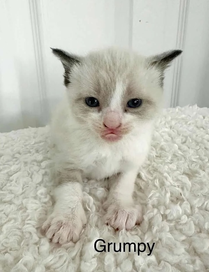 The weeks that followed brought progress. Snow White’s weight stabilized. The kittens grew. Doc discovered that laps were his favorite napping spot, curling into Lori as though he’d been born to be a companion. Grumpy, though serious-faced, blossomed into a sturdy young cat, his white-tipped tail a playful contrast to his otherwise stately demeanor.