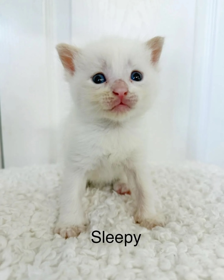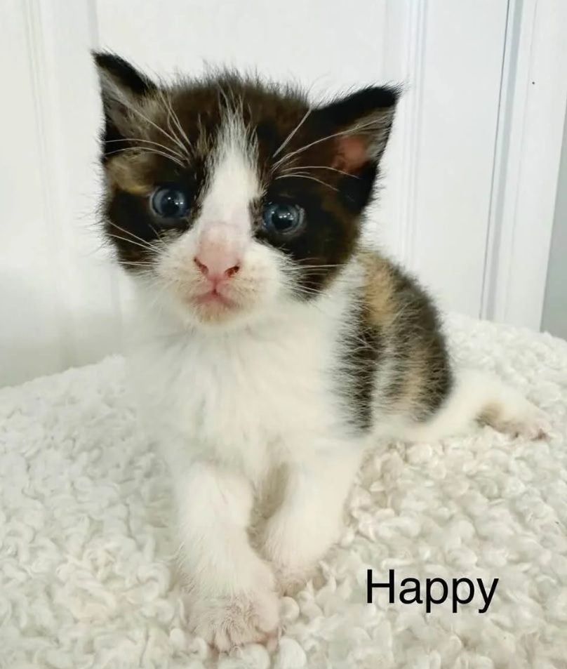 Bashful, the tiniest, was also the bravest. Her split-face coloring made her look like two kittens stitched together, and she wore it like a badge of uniqueness. Despite her small size, she scaled mountains of supplies, wrestled her siblings, and sometimes toppled over like a little turtle—legs flailing, determination written all over her.