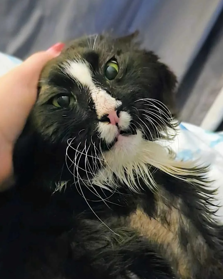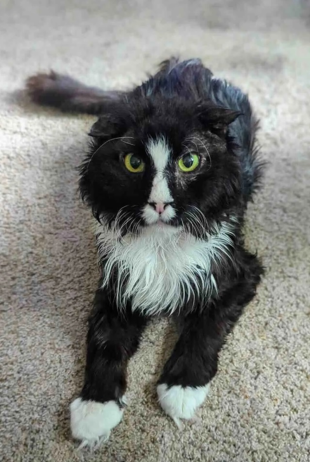 The signs of hardship painted themselves across his body. His ears, once soft and unblemished, became mangled from untreated ear mites that caused painful swelling and hematomas. His black-and-white fur, which should have been sleek and glossy, grew into thick, painful mats that pulled at his skin with every movement.